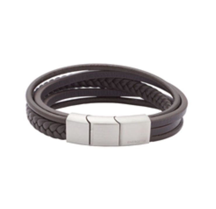 Gleich drei verschiedene Lederprofile vereinen sich bei diesem Armband zu einem sportlich-lässigen Schmuckstück für Herren. Die Bänder mit rundem, flachem und geflochtenem Querschnitt kommen in ihrer unterschiedlichen Machart durch die dunkelbraune Farbgebung besonders effektvoll zur Geltung, Mithilfe des Verschlusses aus gebürstetem Edelstahl könne Sie die Grösse dieses maskulinen Armbandes zwischen M und L variieren.