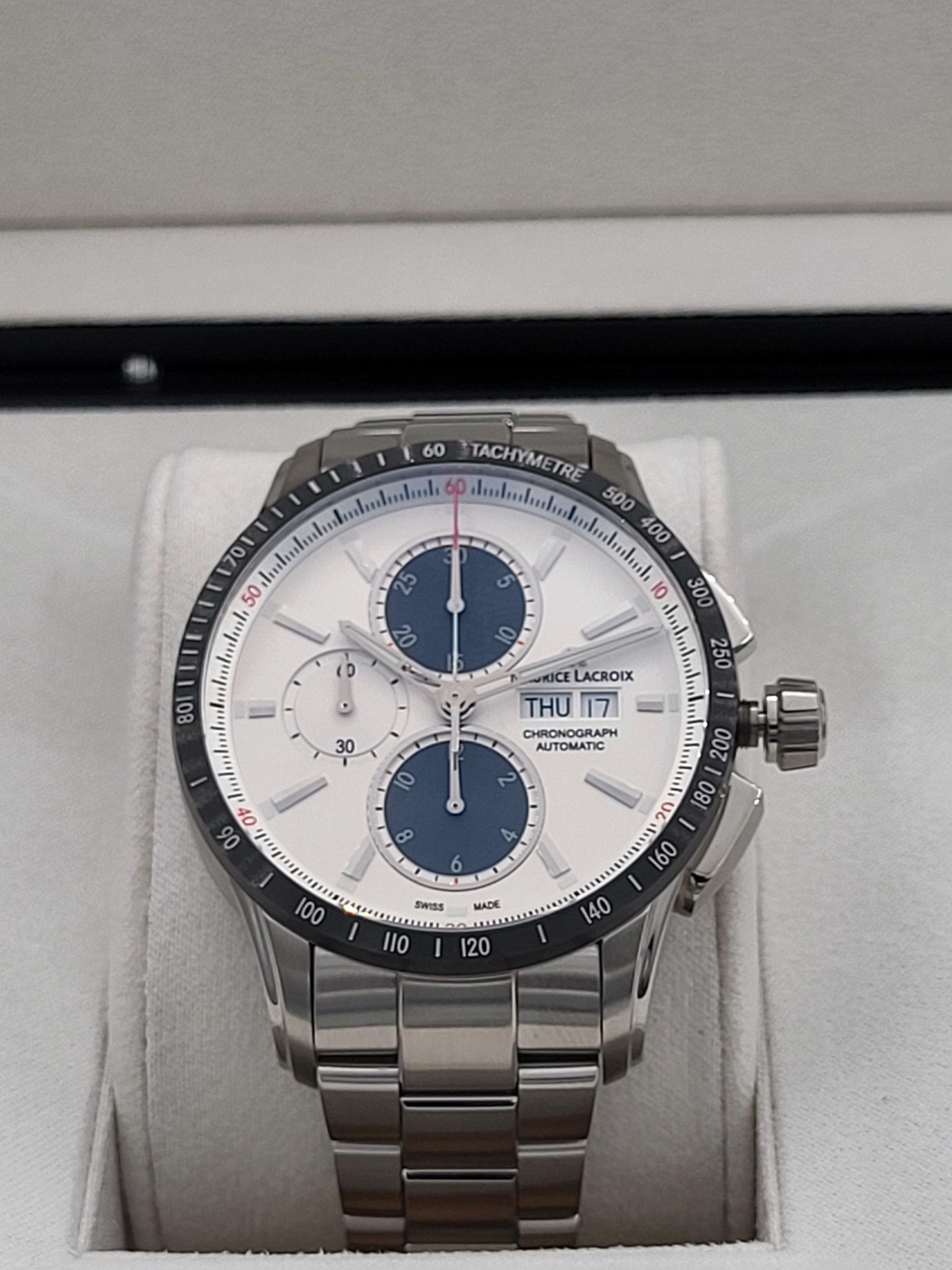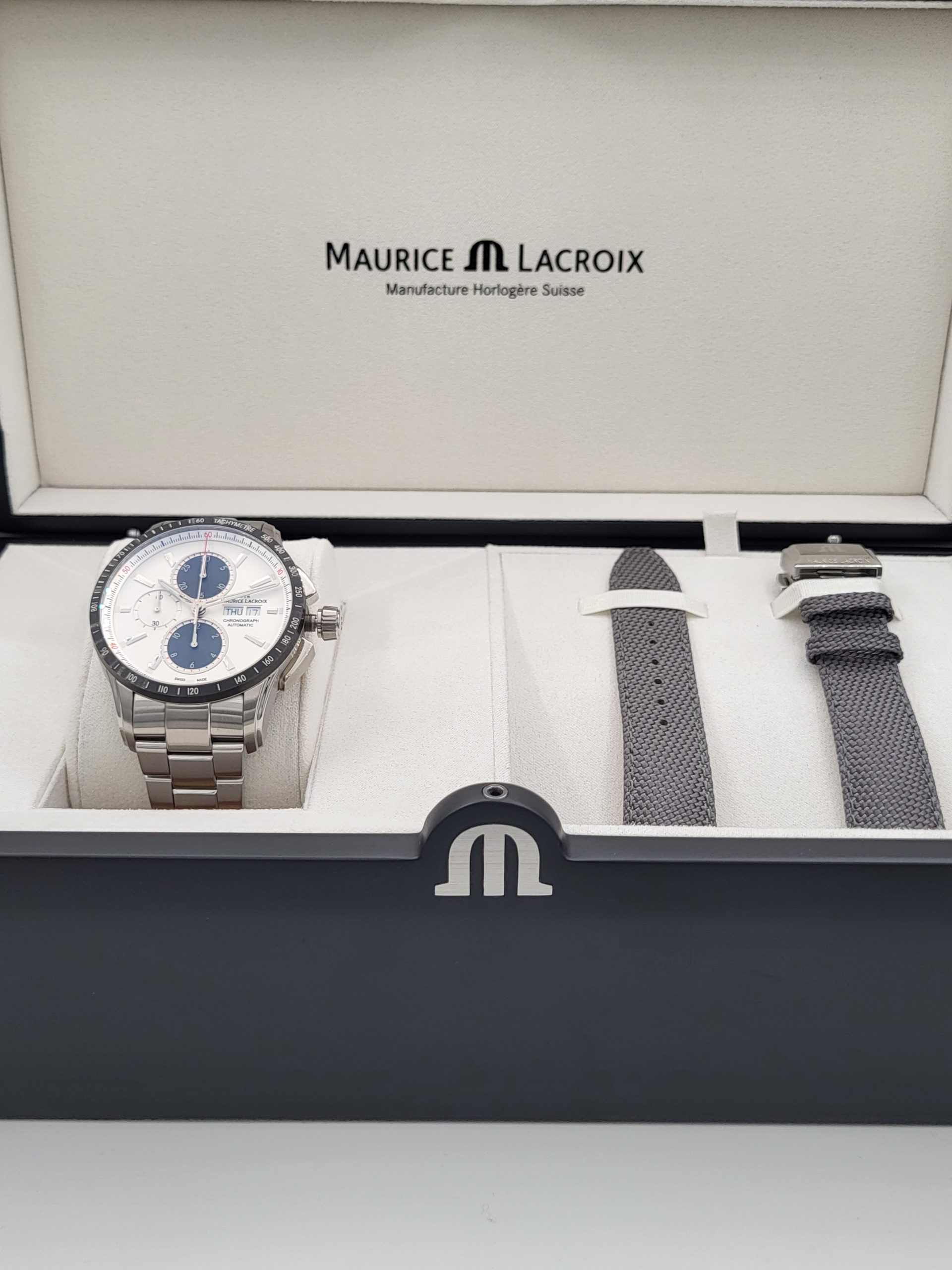 Maurice Lacroix Pontos S Chronograph Automatic Tag/Datum. Bei dieser Maurice Lacroix sind zwei Bänder inklusiv! Diese können mit einem Schnell-wechsel System selber gewechselt werden!