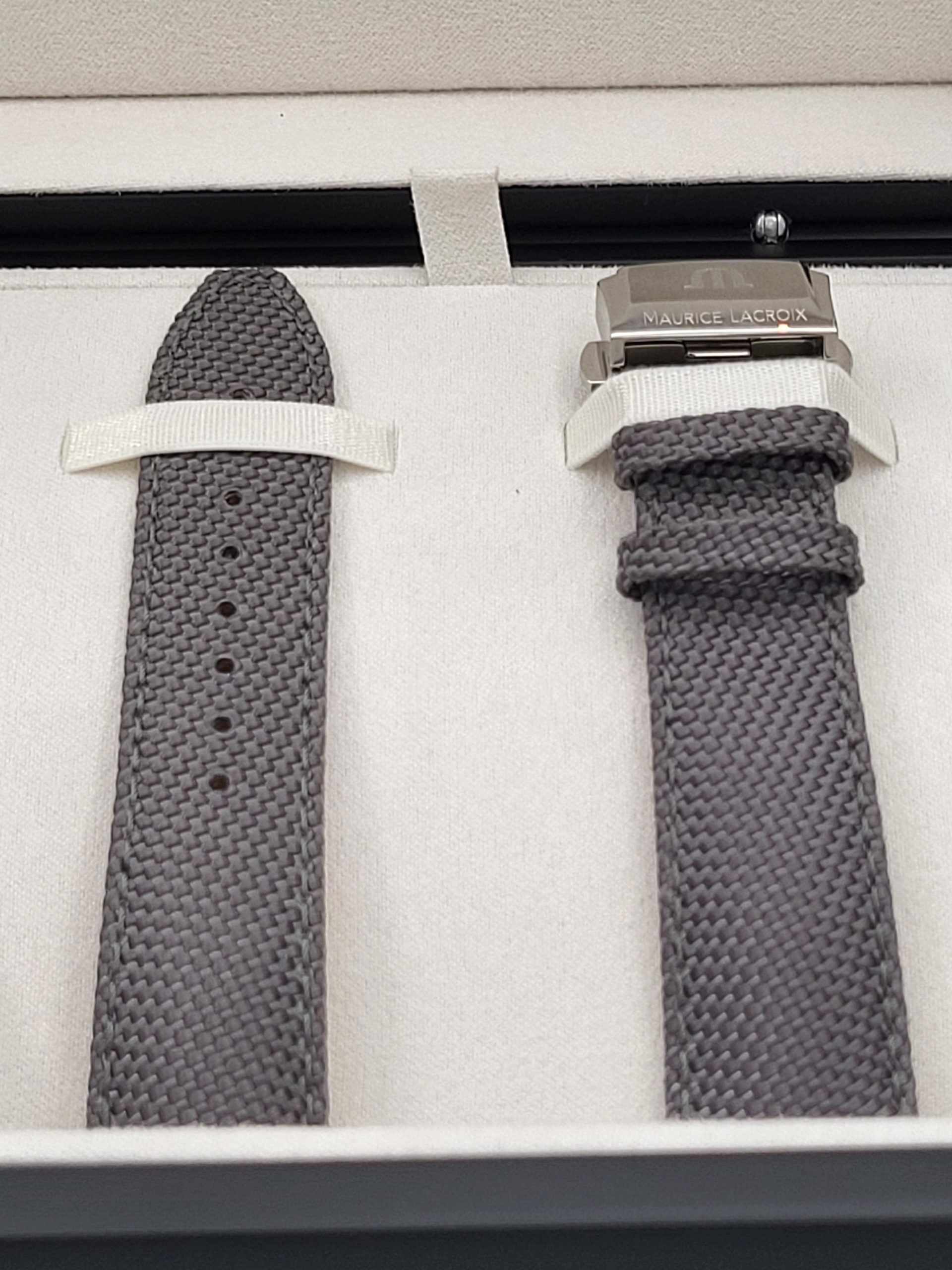 ARMBAND/GURT: Grauer Nylonriemen mit dem Maurice Lacroix ‘m’-Logo