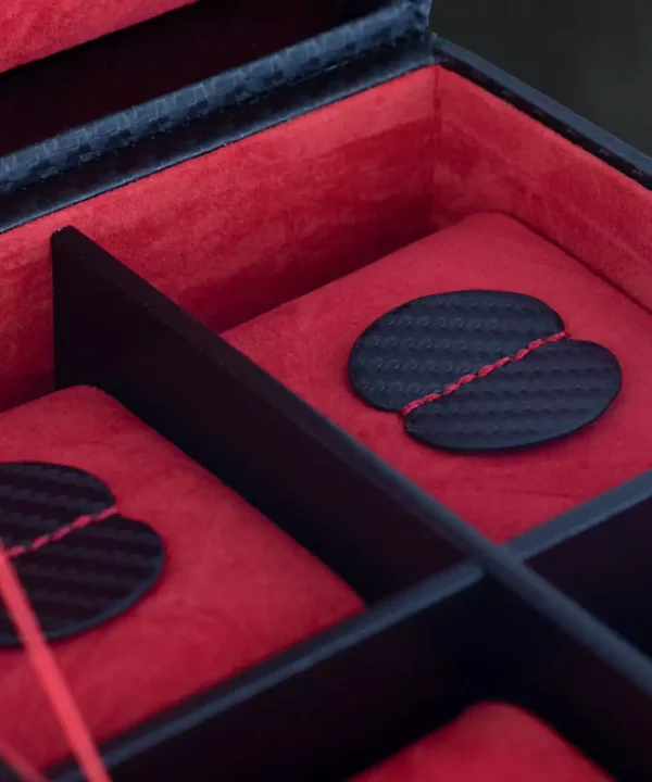 Sattes rot, umhüllt von einer edlen Ummantelung in Carbon Optik – so präsentiert sich die neue Serie Carbon. Bestehend aus Uhrenboxen für eine, zwei, drei, vier oder zehn Uhren sowie einem Manschettenknopfetui bietet diese Serie einen ganz besonderen Aufbewahrungsort für Ihre wertvollen Schmuckstücke. Die feinen, in rot abgenähten Ziernähte verleihen der Serie zusätzlich einen ganz besonderen Charme.